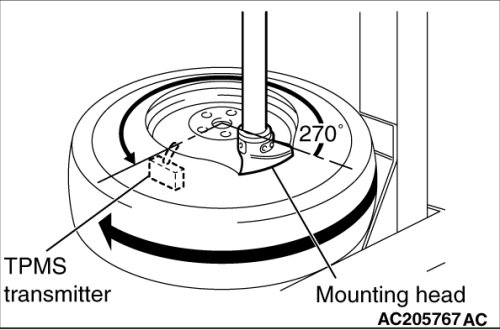 1. Place wheel and tire on turntable of tire mounting machine. Ensure that transmitter is 270 degree angle (3 o'clock position) from mounting head when the outer tire bead is mounted as illustrated.