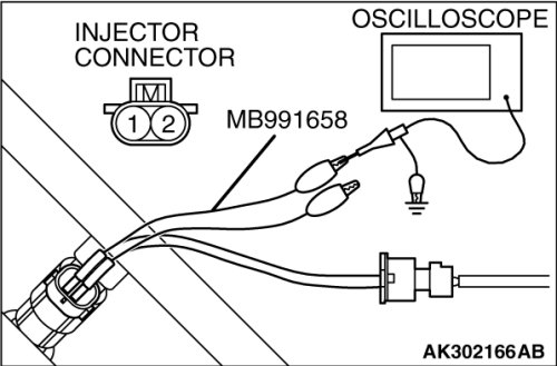 3. Connect the oscilloscope probe to injector connector terminal No. 2.