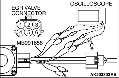 2. Connect the oscilloscope probe to the EGR valve connector terminal No. 1, terminal No. 3, terminal No. 4, terminal No. 6 respectively.