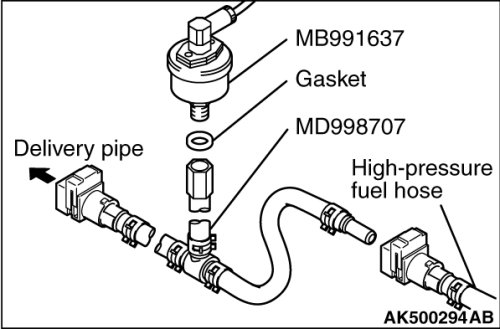 3. Via a gasket, install the special tool MB991637 (fuel pressure gauge set) into the special tool that has already assembled as described.