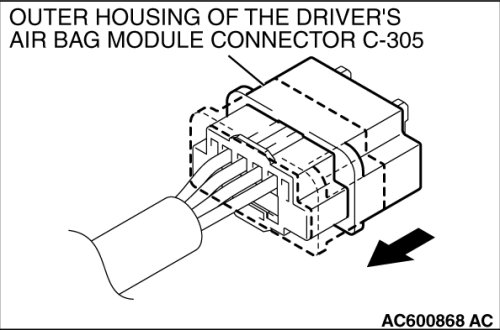 4. Slide the outer housing of the driver's air bag module connector C-305 in the arrow direction shown, and disconnect the connector.