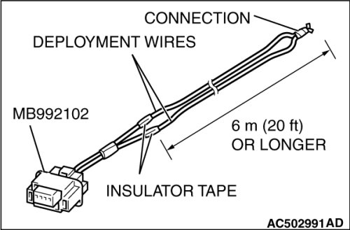 5. Connect deployment wires, each 6 meters (20 feet) or longer, to the two leads of special tool MB992102, and cover the connections with insulator tape. The other ends of the deployment wires should be connected to each other (short-circuited), to prevent sudden unexpected deployment of the air bag module.