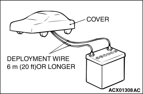 5. Connect deployment wires, each 6 meters (20 feet) or longer, to the two leads of special tool MB9921020, and cover the connections with insulator tape. The other ends of the deployment wires should be connected to each other (short-circuited), to prevent sudden unexpected deployment of the air bag module.