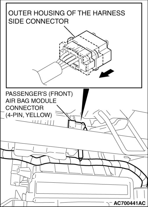 If the passenger's (front) air bag module connector is disconnected from the inflator connector, both electrodes of the from the inflator connector will be automatically shorted to prevent unintended deployment of the air bag due to static electricity, etc.