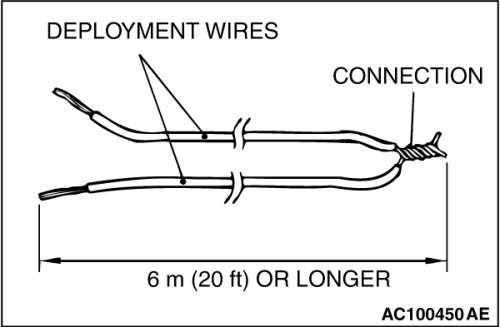5. Connect deployment wires, each 6 meters (20 feet) or longer, to the two leads of special tool adapter harness (MB991885), and cover the connections with insulator tape. The other ends of the deployment wires should be connected to each other (short-circuited), to prevent sudden unexpected deployment of the air bag module.