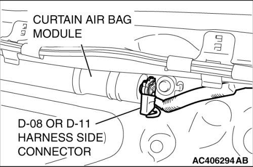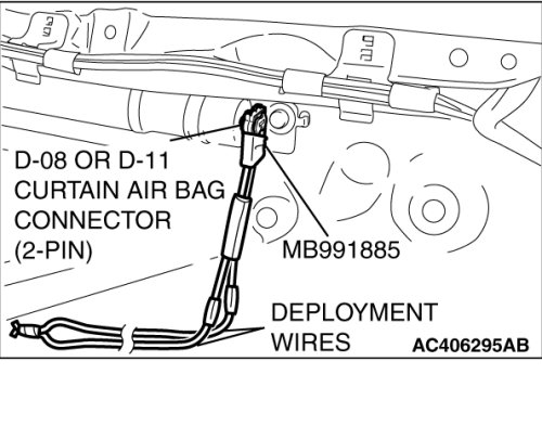 6. Connect the D-08 or D-11 curtain air bag module two-pin connector (black) to special tool adapter harness (MB991885), and move the deployment wires out of the vehicle.