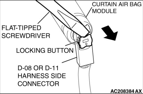 4. Disconnect harness side connector D-08 or D-11 (two-pin, black) from the curtain air bag module.
