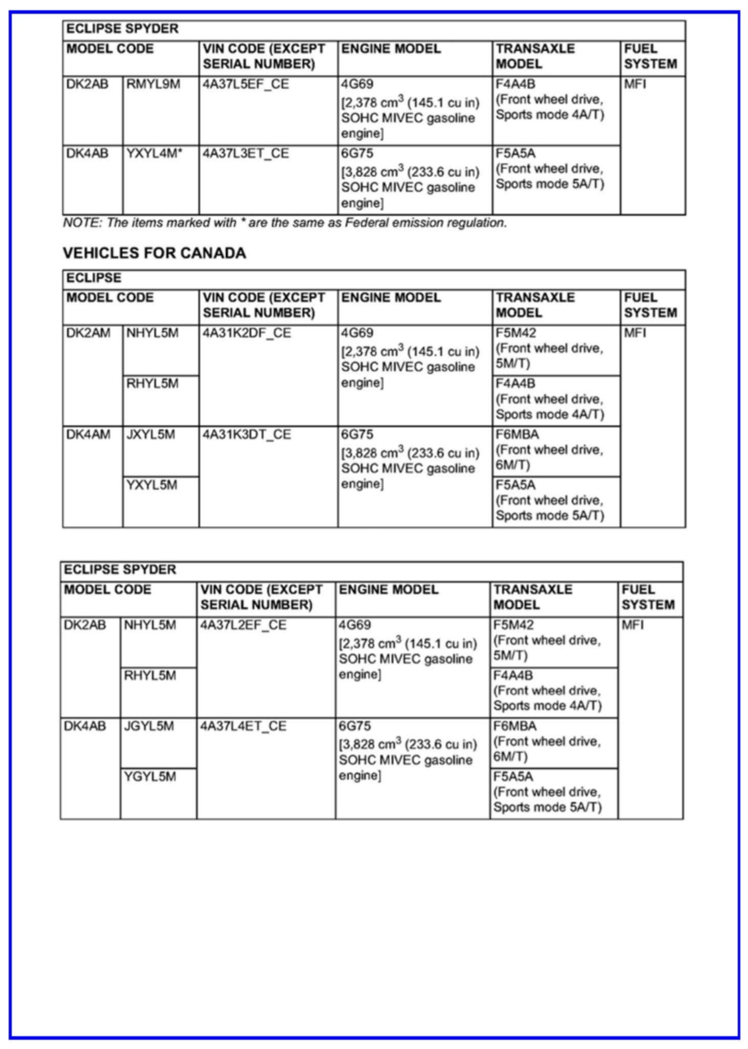 This TSB contains new service information specific to 2012 models and supplements the 2011 Eclipse/Eclipse Spyder Service Manual to provide complete repair information for 2012 models.