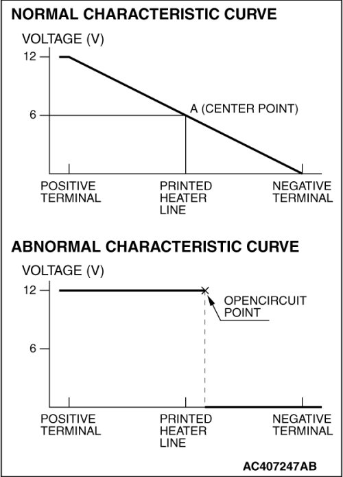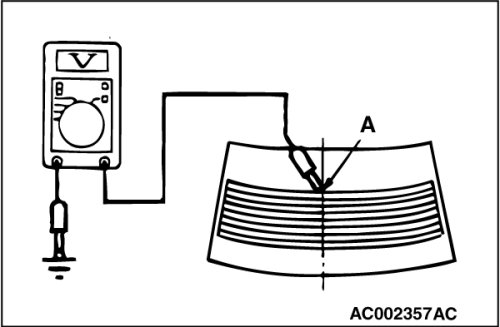 2. Turn "ON" the rear window defogger switch. Measure the heater element voltage with an ohmmeter at the rear window glass center A. Condition is good if it indicates about 6 V.