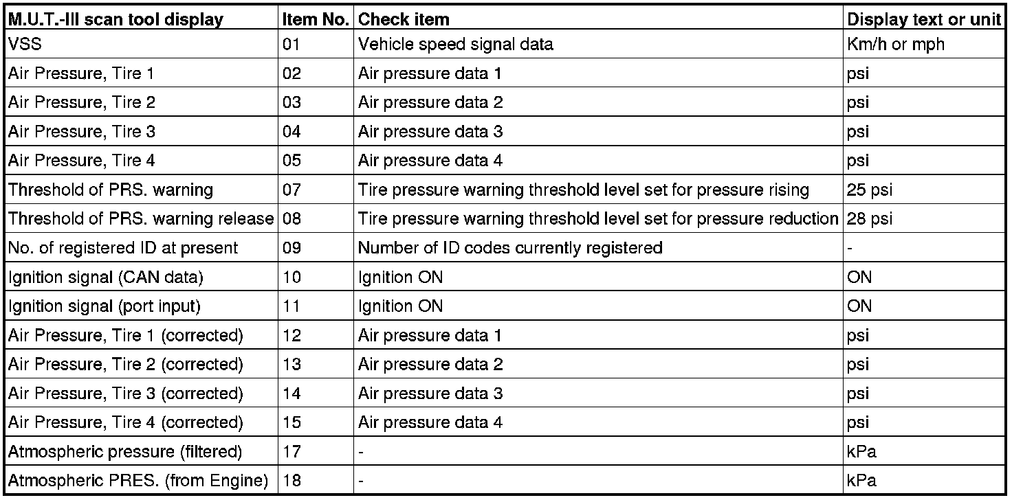 The following items can be read by the scan tool from the TPMS receiver input data.