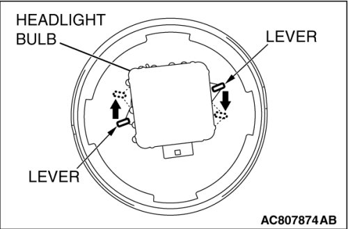 2. Operate the lever toward the direction shown and fix the headlight bulb.