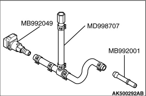 5. Install the special tool MB992049 (quick connector) and the special tool MB992001 (hose adapter) to the hose without the adopter.