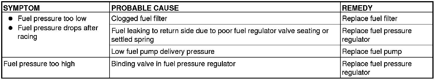 13. If any of fuel pressure measured in steps 11 to 12 is out of specification, troubleshoot and repair according to the table below.