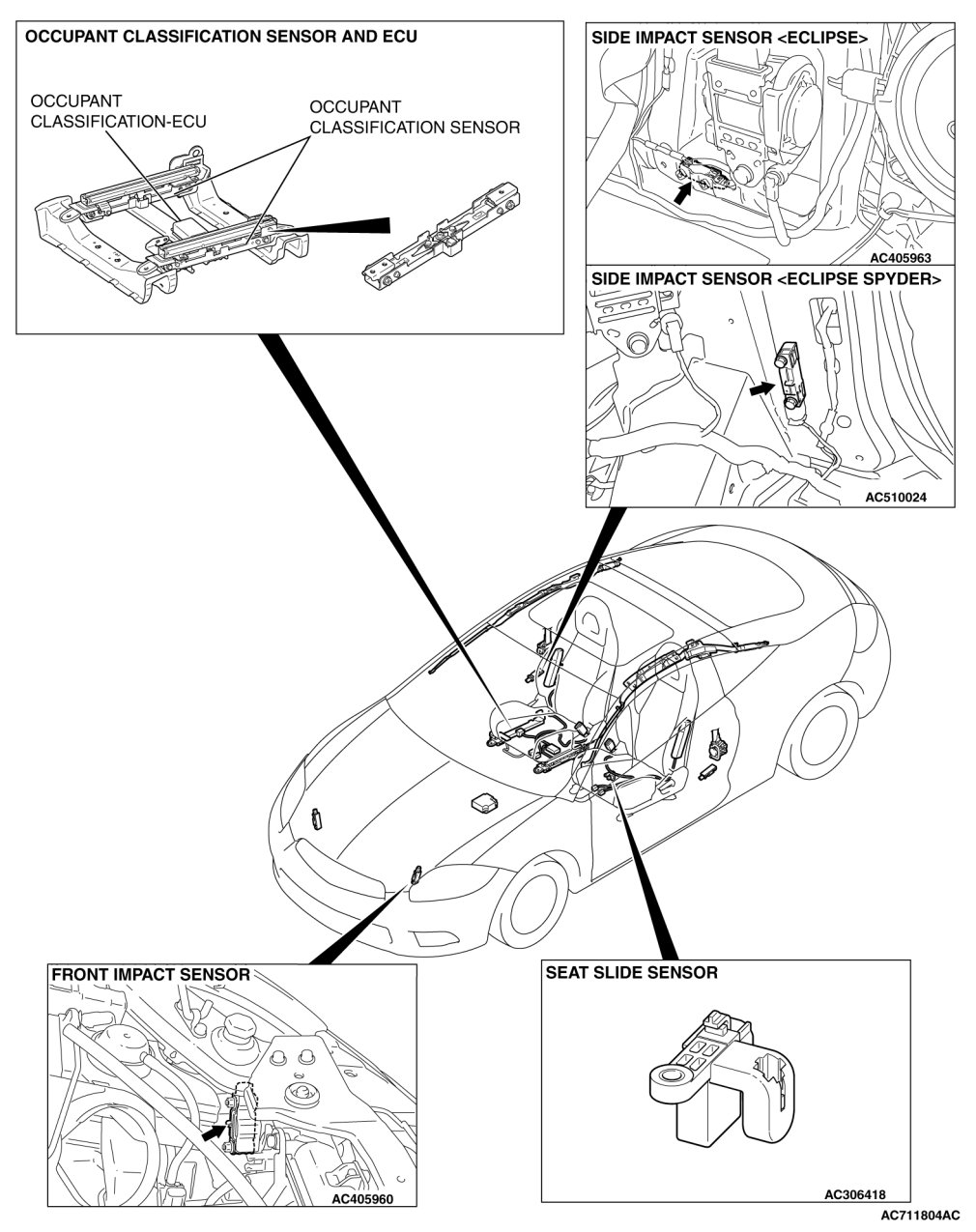 The illustration above shows the front impact sensor (LH) and the side impact sensor (RH).