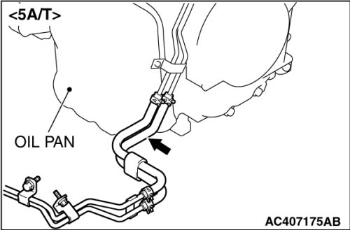 1. Disconnect the hose shown in the illustration which connects the transaxle and the oil cooler (inside the radiator). Place a container under the hose to collect the discharge.