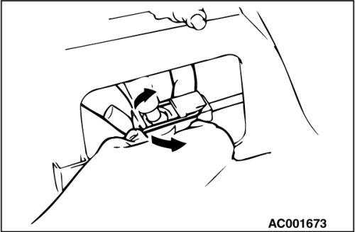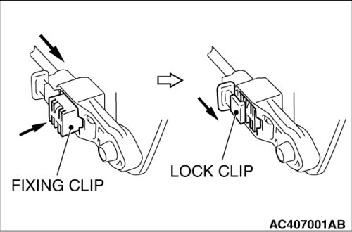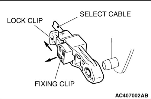 4. Pulling the select cable slightly towards the cabin side, press in the fixing clip of the select cable. Then, return the lock clip back to the original state.