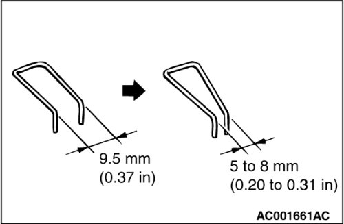 1. Make sure that there is no excessive play at the shift cable end clip. If there is excessive play or the clip is disengaged from the shift cable end, check the clip opening gap. If the gap is more than 9.5 mm (0.37 inch), squeeze the clip until the gap reaches 5 to 8 mm (0.20 to 0.31 inch).