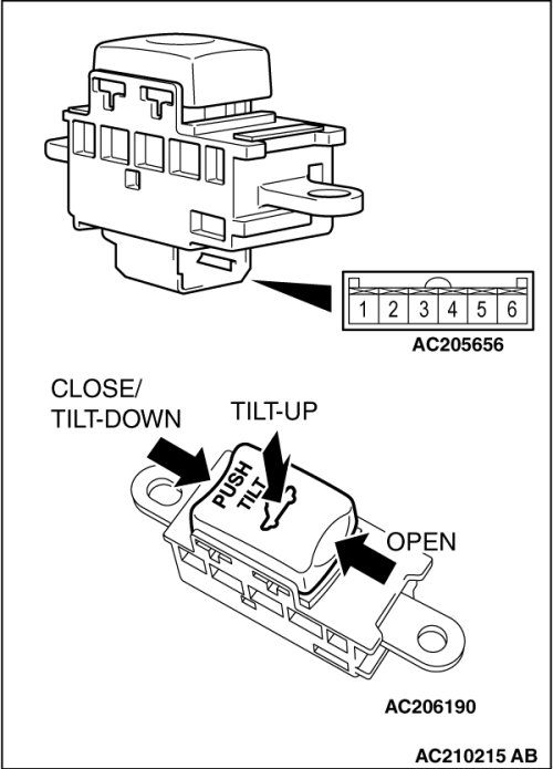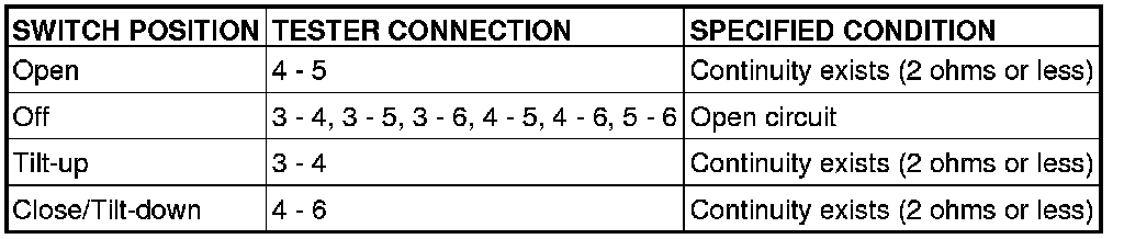 Check continuity when the sunroof switch is operated to "OPEN", "TILT UP" or "CLOSE/TILT DOWN" positions. Testing and Inspection.