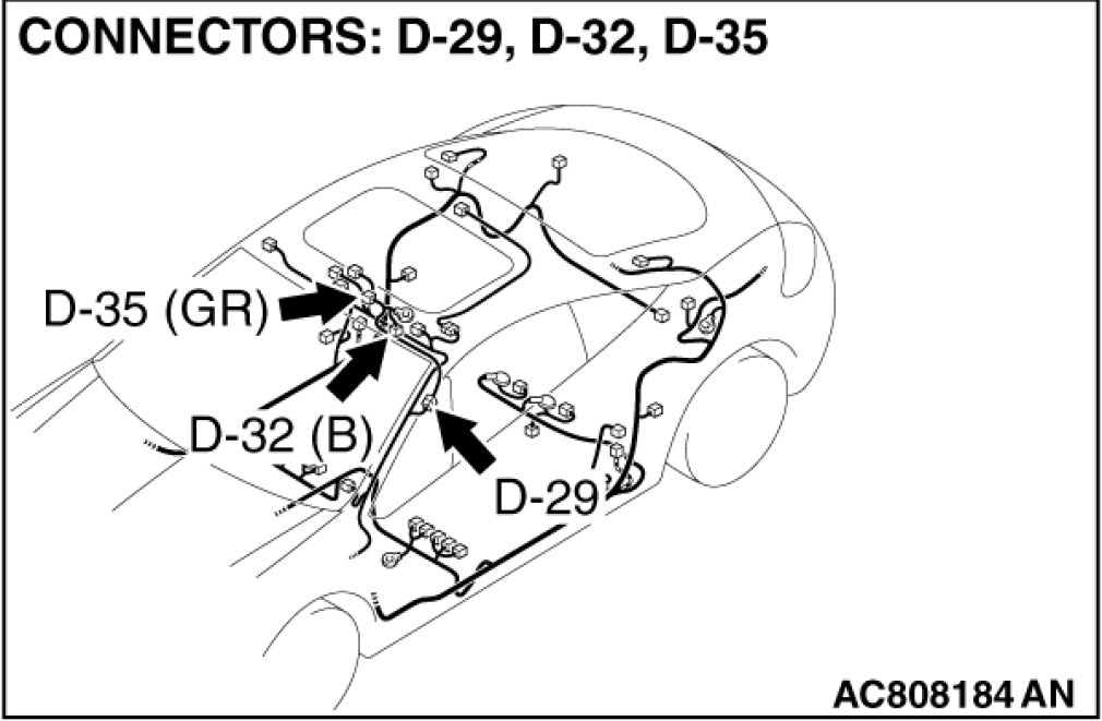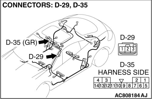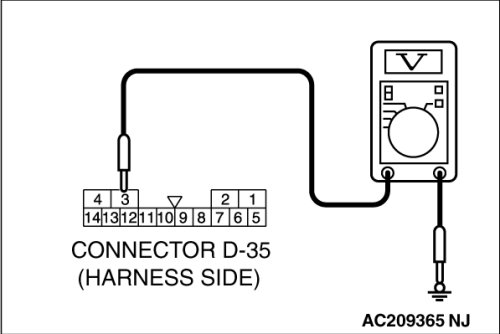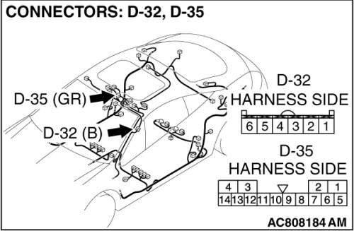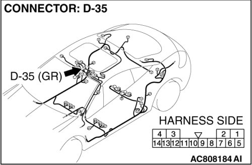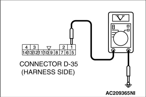 (1)Disconnect sunroof motor assembly connector D-35 and measure the voltage available at the wiring harness side of the connector.
