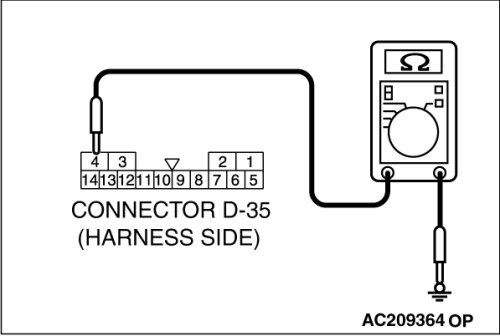 (1)Disconnect sunroof motor assembly connector D-35 and measure the resistance available at the wiring harness side of the connector.
