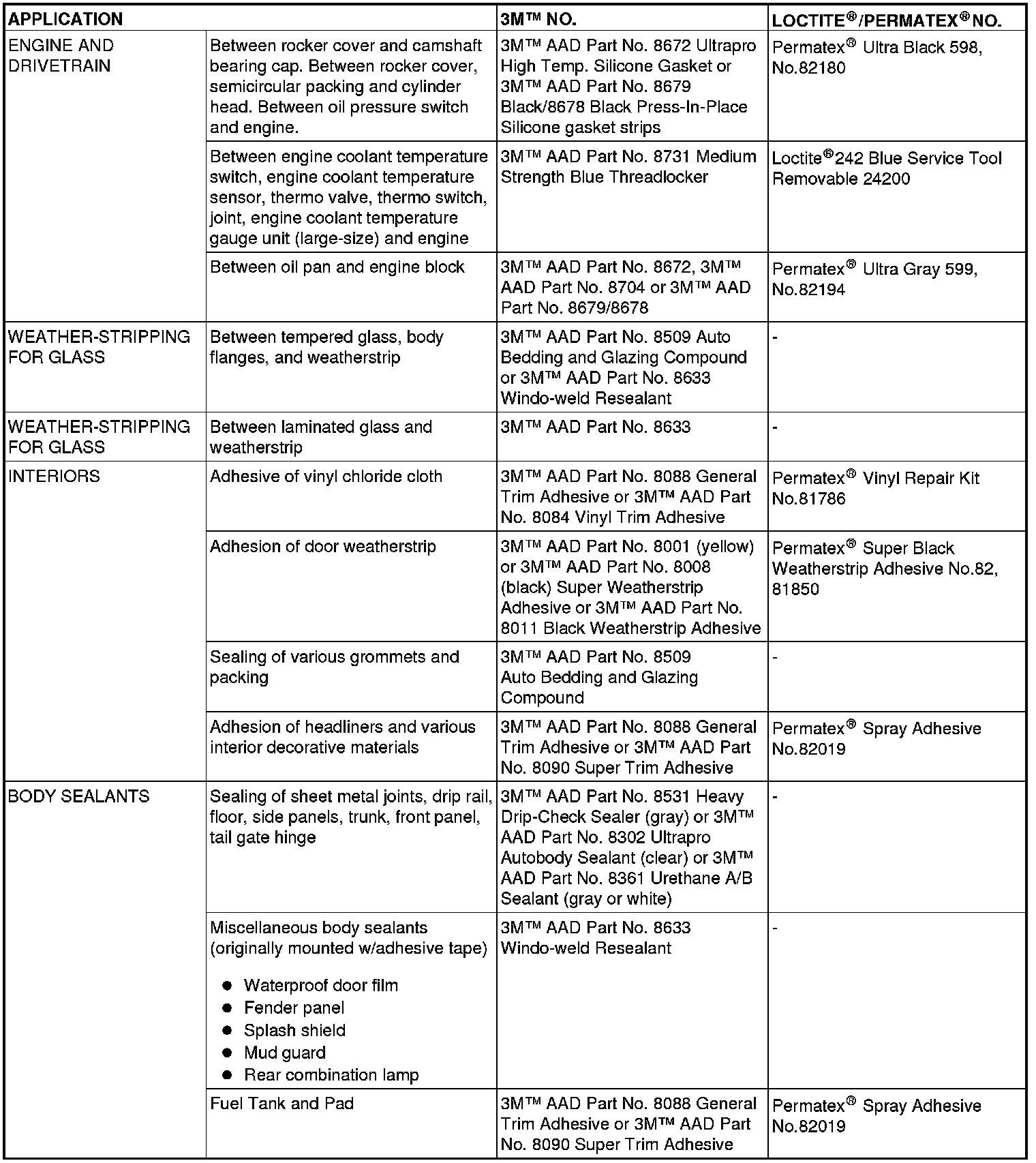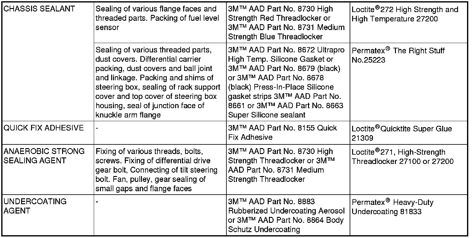 MAIN SEALANT AND ADHESIVE TABLE