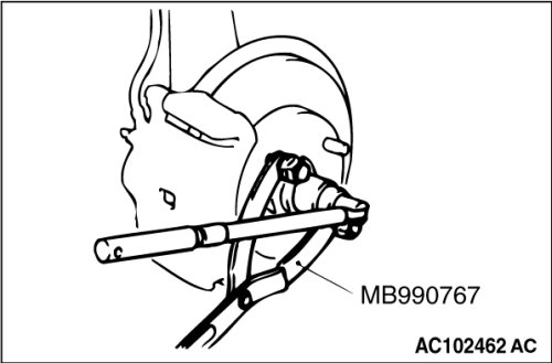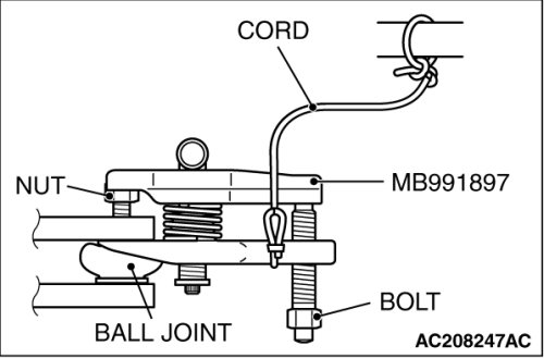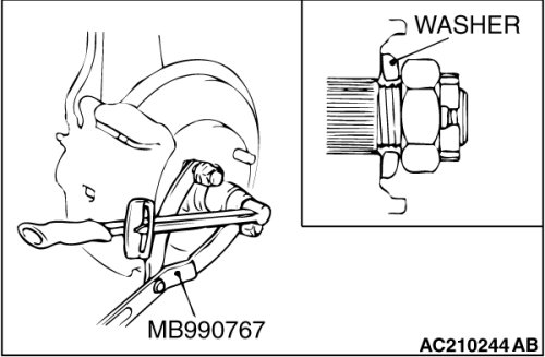 Replace the self locking nut with a regular nut, because the original one is a little bit large to install the special tool. Install special tool MB991897 as shown in the figure.