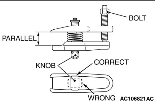 2. Turn the bolt and knob as necessary to make the jaws of special tool MB991897 parallel, tighten the bolt by hand and confirm that the jaws are still parallel.