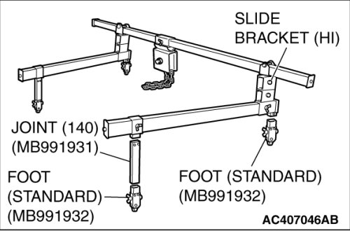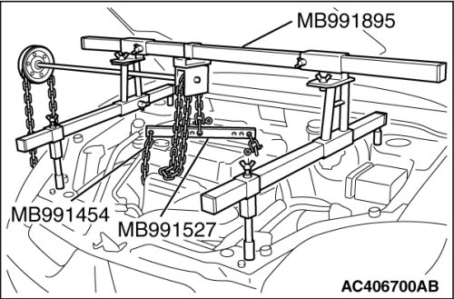 (1) Set special tool MB991895 to the front fender mounting bolts (A and B) and the radiator support upper insulator mounting bolts (C and D), which are located in the engine compartment, as shown.