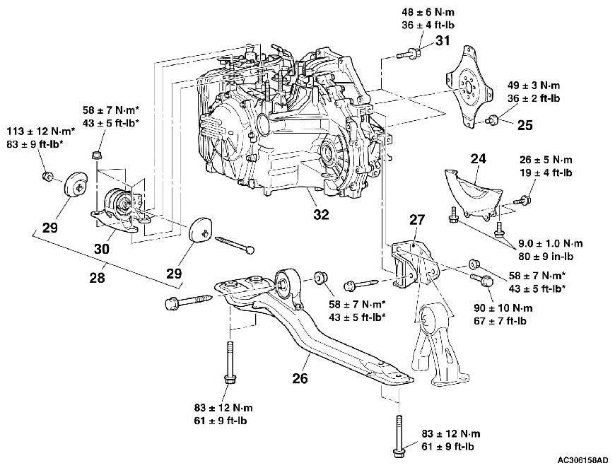 *: Indicates parts which should be temporarily tightened, and then fully tightened after placing the vehicle horizontally and loading the full weight of the engine on the vehicle body.