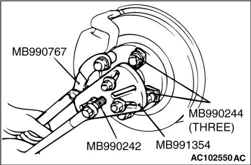 1. Use special tools MB990242, MB990244, MB991354 and MB990767 to push out the drive shaft or the drive shaft and inner shaft assembly from the hub.