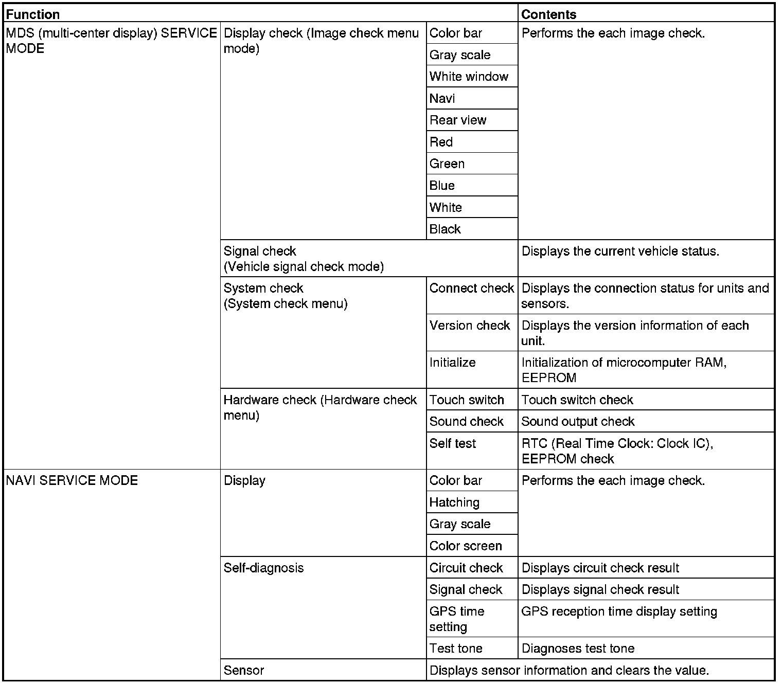 When "Hardware Check" is touched on the MDS (multi-center display) service menu, the menu is switched to the Hardware Check menu. From this menu, the switching to various hardware check modes is performed.