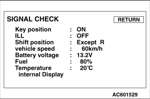 - Signal Check: Vehicle signal check mode (key position, ILL, shift position, vehicle speed, battery, fuel amount, internal temperature of multi-center display)