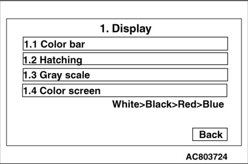 When "Display" is touched on the Navi service menu, the menu is switched to the Display menu. From this menu, the switching to various check modes is made. Also, when "Back" is touched on the image check mode screens, the screen returns to the Display menu.