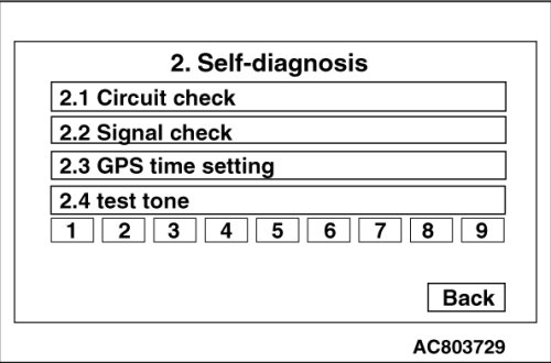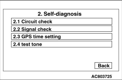 When "Self-Diagnosis" is touched on the Navi service menu, the screen is switched to the Self-Diagnosis menu. From this menu, the switching to the circuit check mode, signal check mode, GPS time setting mode, or test tone mode is performed. Also, when "Back" is touched on the check mode screens, the screen returns to the Self-Diagnosis menu.