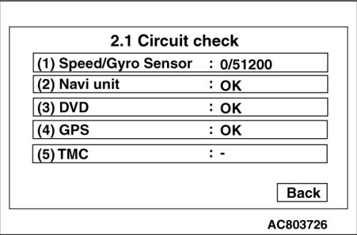 - When "circuit check" is touched, the vehicle speed, gyro angle speed, internal RAM status of navigation unit, DVD drive, or GPS antenna connection status is displayed.