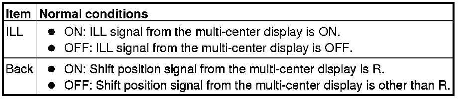 When "Signal Check" is touched on the MDS (multi-center display) service menu, the mode is switched to the SIGNAL CHECK mode, and the current values for following signals are displayed.