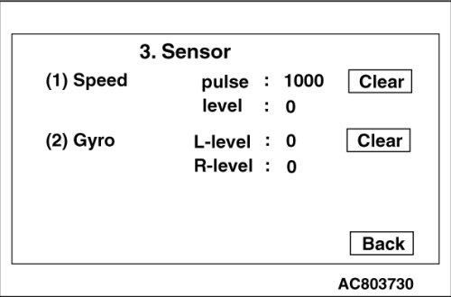 - Sensor: Displays and clears the values of the speed sensor pulse, distance calibration level, and gyro calibration level (right and left).
