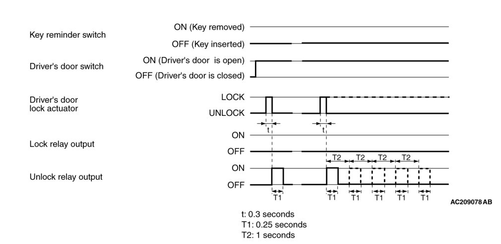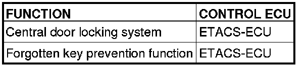 If the driver's door is locked while it is open and when the key is still in the ignition key cylinder, approximately 0.3 second later the ETACS-ECU activates the unlock relay output for 0.25 second to prevent the door from being locked with the key inside the vehicle.