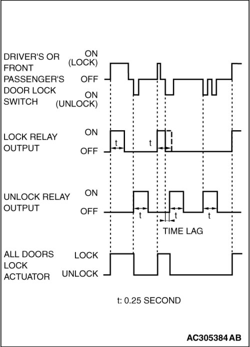 When the door is locked and unlocked by driver's or front passenger's door lock switch consecutively, the ETACS-ECU operates its door lock relay and passes a current through the door lock actuators of all doors for 0.25 second to lock all doors. Then, the ETACS-ECU operates its door unlock relay and passes a current through the door lock actuators of all doors for 0.25 second to unlock all doors. Due to this, there may be a time lag between the driver's or front passenger's door lock switch actuation and the time when all doors are unlocked.