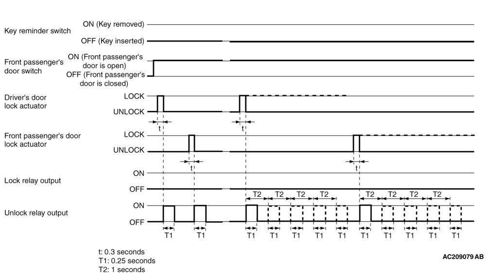 If the passenger's door or driver's door are locked while the passenger's door is open and when the key is still in the ignition key cylinder, approximately 0.3 second later the ETACS-ECU activates the unlock relay output for 0.25 second to prevent the door from being locked with the key inside the vehicle.