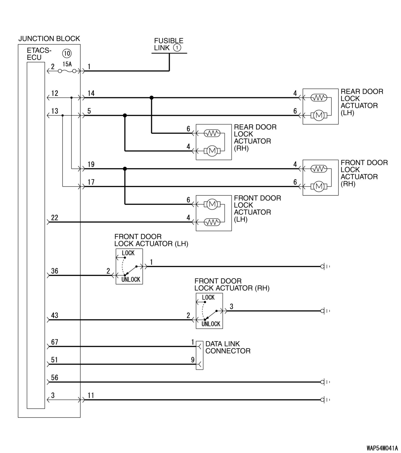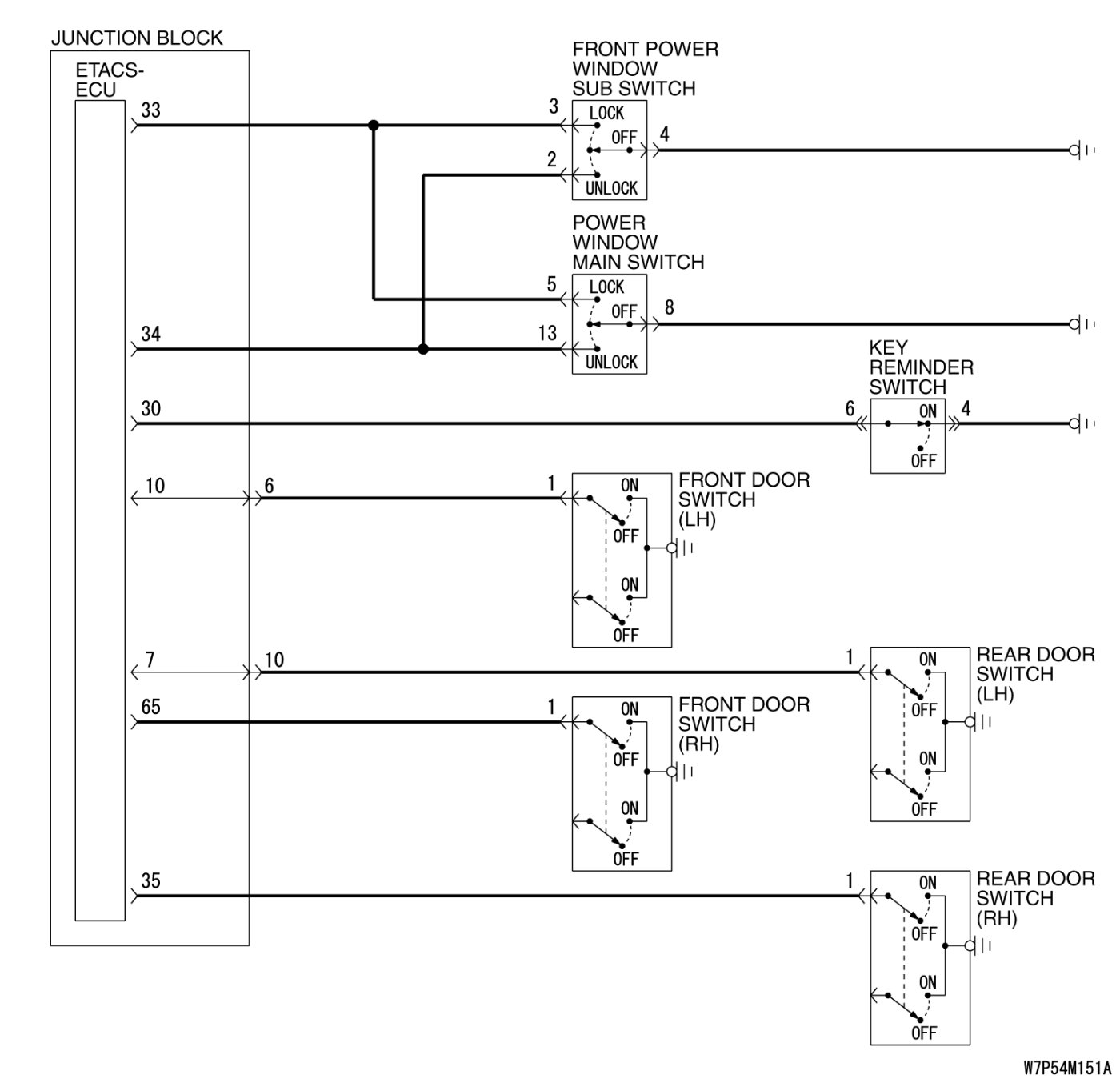 When the door is unlocked by the driver's or front passenger's door lock switch, the ETACS-ECU operates its door unlock relay and passes a current through the door lock actuators of all doors for 0.25 second to unlock all doors.