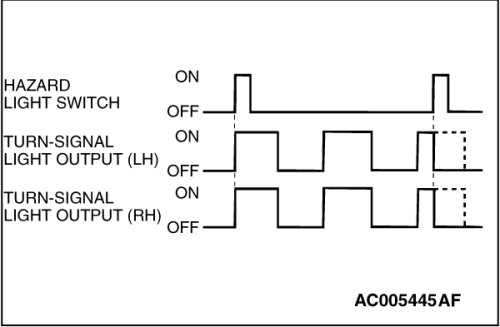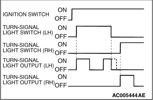 The turn-signal light output (flashing signal) is turned ON when the ignition switch is ON and the turn-signal light switch is ON (LH or RH). If the front turn-signal light or rear turn-signal light bulb has burned out, the flashing speed increases to indicate that the bulb has burned out.
