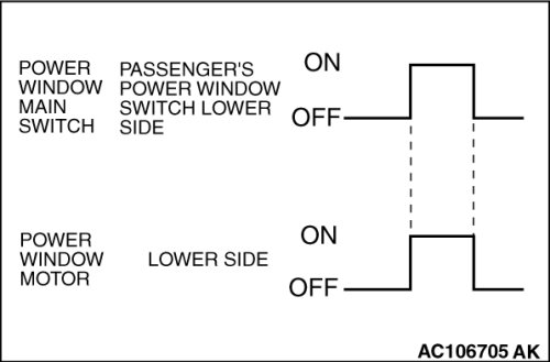 When the passenger's power window switch on the power window main switch is pushed down, the system energizes its respective power window motor, and then the passenger's window glass lowers.