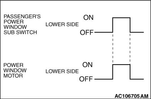 When the power window sub switch is pushed down, the system energizes its respective power window motor, and then the passenger's window glass lowers.