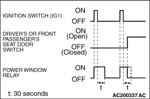 Even after the ignition is switched off, the ETACS-ECU keeps the power window relay activated for approximately 30 seconds, enabling raising and lowering of the power windows by using the power window switches. After approximately 30 seconds, the power window relay is deactivated.