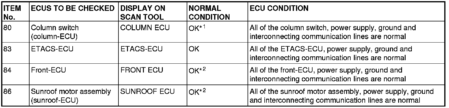- *2: When "NG" is displayed beside "ETACS ECU", the scan tool shows "NG" beside the "FRONT ECU" and "SUNROOF ECU".