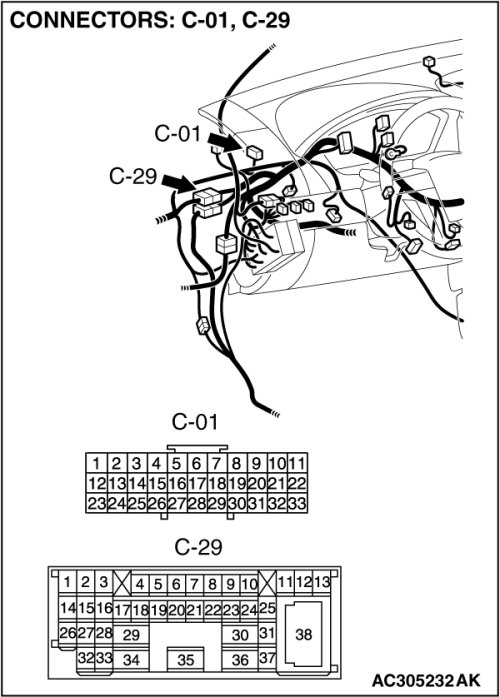 Also check intermediate connector C-29 and joint connector C-01 for loose, corroded, or damaged terminals, or terminals pushed back in the connector. If intermediate connector C-29 or joint connector C-01 is damaged, repair or replace the connector as described in Harness Connector Inspection Harness Connector Inspection.