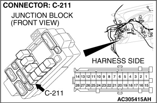 Also check junction block connector C-211 for loose, corroded, or damaged terminals, or terminals pushed back in the connector. If junction block connector C-211 is damaged, repair or replace the damaged component(s) as described in Harness Connector Inspection Harness Connector Inspection.
