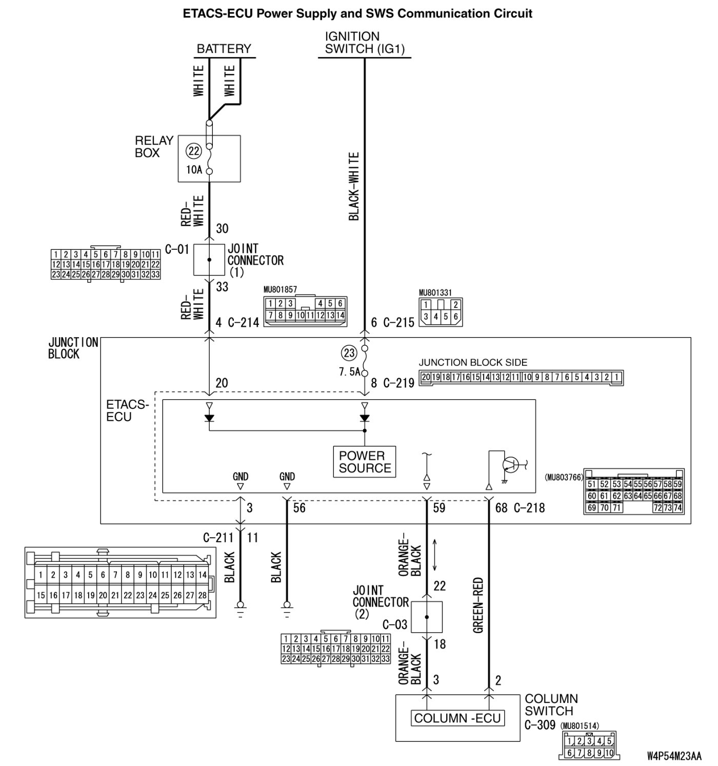 It is suspected that the power supply circuit to the ETACS-ECU is defective, or the wiring harness between the SWS monitor kit and the ETACS-ECU or their connector(s) is damaged. If the battery power supply circuit to the ECU (terminal 20 of the ETACS-ECU) is damaged, also check the power supply circuit from the ignition switch (IG1) (terminal 8 of the ETACS-ECU), and repair if necessary. If the ground circuit to the ECU (terminal 3 of the ETACS-ECU) is damaged, also check the ground circuit to the sensor (terminal 56 of the ETACS-ECU), and repair if necessary.