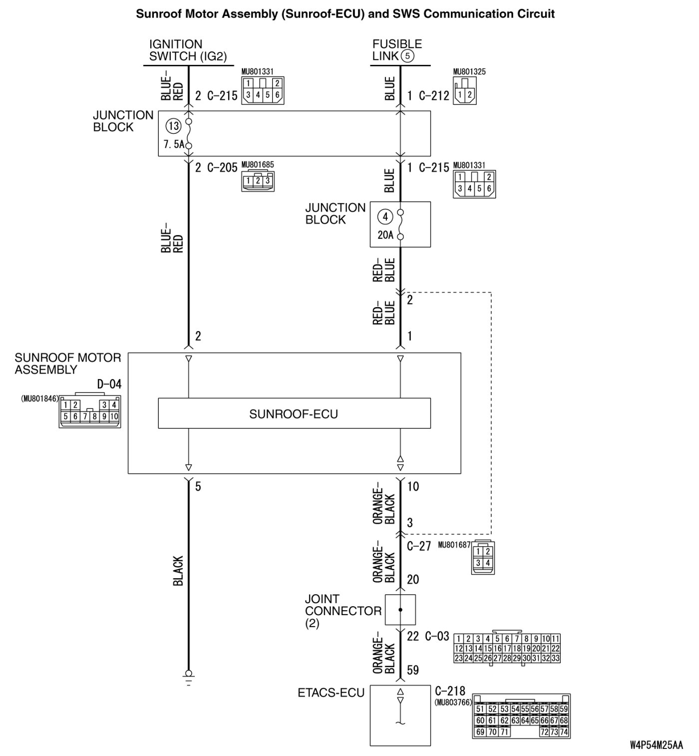 Q. Is the wiring harness between sunroof motor assembly connector D-04 (terminal 10) and ETACS-ECU connector C-218 (terminal 59) in good condition?